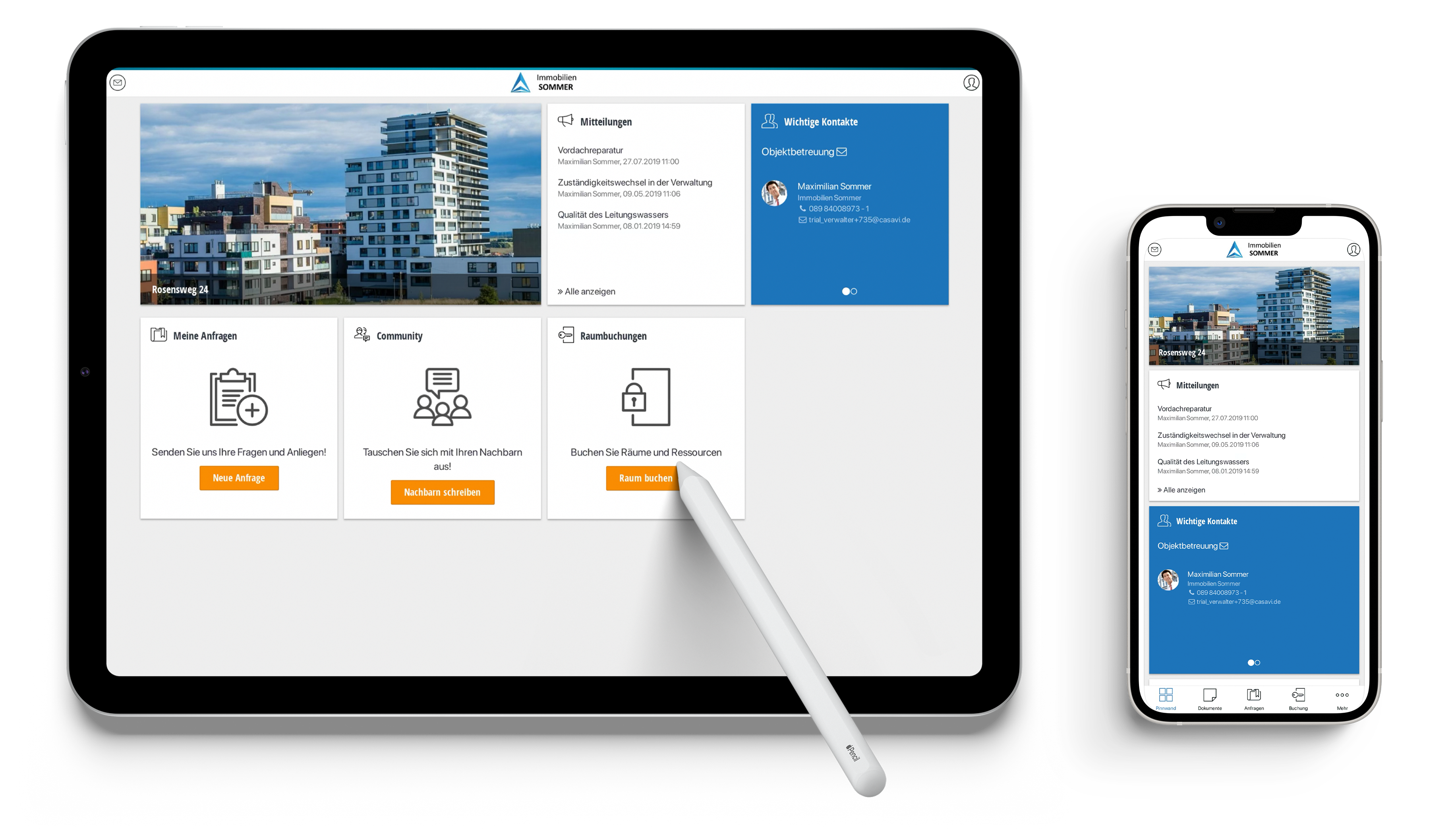 zusammen. Hierdurch werden Erfahrungen mit der Moderne gegenseitig bereichert. Mietern und Eigentümer wird neben ihren persönlichen Ansprechpartner auch die Möglichkeit der Nutzung eines Kundenportals Casavi angeboten. Hier kann jederzeit über das Internet oder App Einsicht in relevanten Unterlagen/Mitteilungen genommen und auch Mängel mit Fotos gemeldet werden.